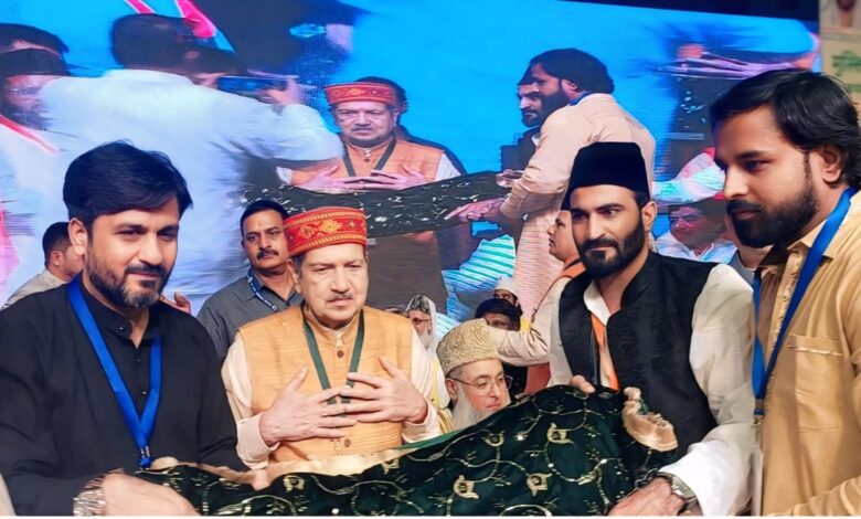 भारतीय सद्भावना मंच सूफी संत प्रकोष्ठ के राष्ट्रीय संयोजक व रोशनी वाली दरगाह बड़े पीर साहब के गद्दी नशीन पीर फैज़ अली के हाथ मे आर एस एस इंद्रेश कुमार ने चादर सौंपी
