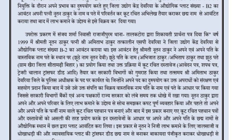 देवरिया पुलिस ने रिटायर्ड IG पुलिस अमिताभ ठाकुर क़ो ज़िला शाहजहांपुर में चलती ट्रेन से अरेस्ट कर जेल भेज दिया। आरोप है की 1999 में SP रहते उन्होंने पद का दुरूपयोग किया। वर्ष 1999 के एक मामले में पुलिस ने 2025 में FIR की थी।रिटायर्ड IG व आज़ाद अधिकार सेना अध्यक्ष अमिताभ ठाकुर क़ो देवरिया की अदालत ने 14 दिन की कस्टडी में जेल भेज दिया। जेल जाते हुए मीडिया के सामने उन्होंने अपनी हत्या की आशंका जताई।