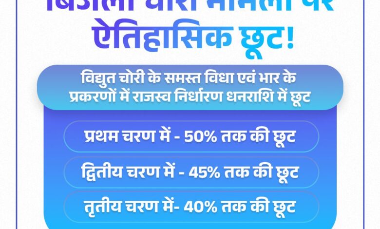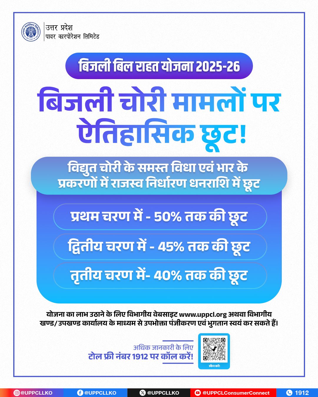 बिजली बिल राहत योजना 2025–26 बीते एक दिसंबर से शुरू हो चुकी है। इस योजना में पहली बार 100% ब्याज माफी के साथ मूलधन पर भी भारी छूट का लाभ मिलेगा।आज ही रजिस्ट्रेशन कराएं। और प्रथम चरण में लाभ पायें।