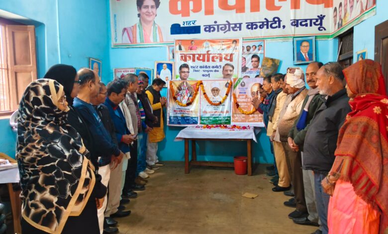 बदायूं 25 दिसंबर 2025 आज पूर्व घोषित कार्यक्रम अनुसार पार्टी आवाहन पर शहर कांग्रेस कमेटी कार्यालय पर जिला कांग्रेस कमेटी के उपाध्यक्ष सुरेश राठौड़ शहर कांग्रेस कमेटी के अध्यक्ष मन्नालाल सागर के संयुक्त नेतृत्व में भारत रत्न चक्रवर्ती राजगोपालाचारी की पुण्यतिथि एवं पंडित मदन मोहन मालवीय तथा बिजली पासी की जयंती मनाते हुए पुष्पांजलि अर्पित की गई एवं गोष्टी का आयोजनकर उनको याद किया गया।
