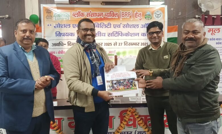 आसफपुर ( बदायूं ) – स्थानीय क्षेत्रीय ग्राम्य विकास प्रशिक्षण संस्थान के प्राचार्य अनुज कुमार श्रीवास्तव , प्रशिक्षण कार्यक्रम अधिकारी पंकज कुमार , प्रशिक्षण कार्यक्रम प्रभारी हरीश उपाध्याय के नेतृत्व में चलाया जा रहा तीस दिवसीय सर्टिफिकेशन कोर्स का प्रशिक्षण कार्यक्रम संपन्न हुआ इस अवसर पर एन आई आर डी हैदराबाद से पधारे सुमेध पाटिल ने सभी प्रतिभागियों को एक एक सामूहिक छायांकन भेंट करते हुए उन्हें शुभ – कामनाएं दीं और भविष्य में सोशल ऑडिट को और अधिक बेहतर व पारदर्शिता के साथ करने के निर्देश दिए ।
